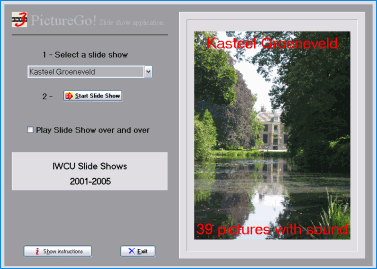 Though more involved than version 3.1, it still can be characterized as a small version. I mostly concentrated on improving 'Automatic Starting CD'. So far it was only possible to have PictureGo! play one slide show of an Automatic Starting CD. Now you can put an unlimited number of slide shows on a CD, that is: space permitting. These shows will appear in an easy drop down menu for the user to choose from.