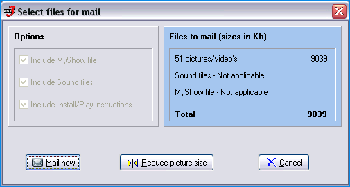 But, there is also some new, and very interesting functionality. For instance: the mailing feature for mailing individual pictures, folders or even complete MyShow files. Not to mention the 'downsizing picture size on the fly' feature that comes with it.